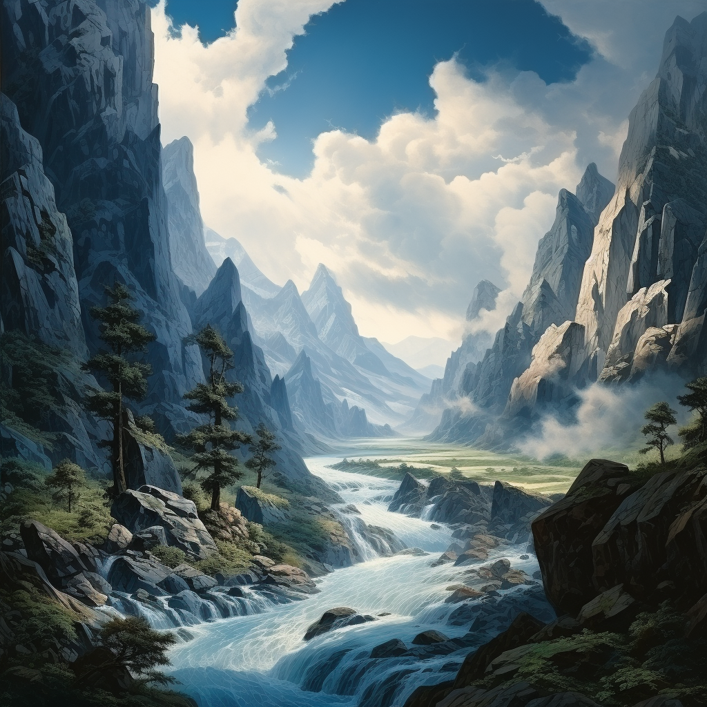 在西方的東邊,一條河流從上到下流動(dòng),隱藏曝光方法,古典主義,16k,高清晰度