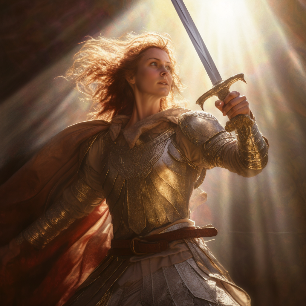 Lorna Heilbron as a medieval warrior wielding a spear, Sunlight, full view, action